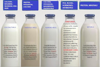 That HUMANS were never meant to consume other mammifer’s milk, and being the ONLY ones that have been DUPED do so, learning how in fact ANIMAL PROTEIN of ANY kind not only does not improve our health but makes our bodies ACIDIC, LEACHING OUT PRECIOUS BONE MINERALS (CALCIUM), CREATING OSTEOPOROSIS, considering the shocking, completely unnecessary CRUELTY that inevitably comes with this sick game in order for our supermarkets to be filled with piles of UNHEALTHY, CRUELTY OBTAINED WHITE SECRETION FILLED WITH PUS from heavily abused sentient beings, MLKED BY MACHINERIES DAY IN DAY OUT…